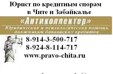 Юрист по кредитам - АнтиКоллектор в Чите. Банкротство физических лиц в Чите. При возникновении трудностей по уплате мы помогаем урегулировать конфликт в досудебном и судебном порядке с банками или коллекторами. Помощь в уменьшении выплат, возврате излишне уплаченных денег, юридическая защита от произвола банков и коллекторов. Новая услуги – представление интересов перед кредиторами.